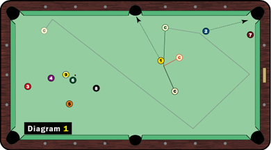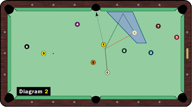 Especially in 9-ball, since you are playing position on only one ball, you often have to move the cue ball from one side of the table to the other to gain position for the next shot. Diagram 2 is a perfect example.