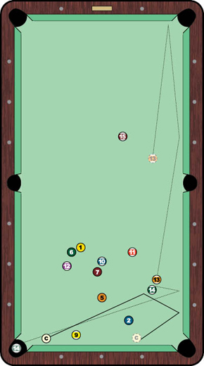 In his seventh-round best-of-3 match with Richie Richeson, the Filipino Hall of Famer was facing a difficult situation. Not necessarily the most well-studied in the discipline, Bustamante was trailing the more seasoned one-holer in Richeson, 2-1. He was also down in the game, three balls to nil. Richeson, who had the bottom right pocket, played safe by banking the 13 ball into the stack and tucking the cue ball on the foot rail near the 9. But the 13 rolled up near the 14 just off the long rail. Innocuous enough - unless you're facing one of the greatest shot-makers of all time. Bustamante took all of 10 seconds to line up the shot in the diagram. Just barely squeaking the cue ball past the 9, Bustamante sent the 14 into the 13 and off the long rail on its way back to his hole. An unbelievable option few could've seen, the shot also left the Filipino with perfect position on the 9 ball to continue his run. Alas, Richeson rebounded to take the game and the set. But when it comes to remarkable creativity and ridiculous precision, it's tough to top this little dandy. (Video clip provided by Accu-Stats Video Productions.)