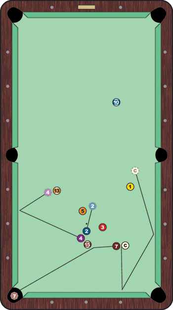 Player: Danny Smith Most entries in our Stroke of Genius catalog have had the benefit of time to truly earn their position among the highlights of pool, no matter the discipline. This month's attempt, though, is about as close as you'll get to an instant classic. American journeyman Danny Smith faced Efren Reyes in late June in the one-pocket version of Accu-Stats' "Make It Happen" series of round-robin tournaments. Facing Reyes, Smith lost the third game in the race-to-3 set to fall behind 2-1. In game four, Reyes collected the first four balls until Smith dropped a pair but then found himself in the unfortunate position in the diagram. Shooting for the bottom left pocket, Smith didn't have much of an angle on anything. He eyed up a possible combo or kiss on the 7, but the three-ball cluster sitting around the foot spot didn't offer much. To add to the degree of difficulty, the 60-second shot clock continued to tick as he went from one object ball's ghost to the next. Smith turned to the referee with 15 seconds remaining to use his one extension, but quickly learned he'd already burned it. Smith then hastily lined up a kiss shot for the 7 off the 15 and into the bottom left. He drilled it perfectly, using backspin to bring the cue ball off the foot rail and right long rail. The rest of the object balls drifted to the left, giving Smith plenty of options to get his next five balls and win the game. He finished the impressive eight-and-out, then topped Reyes in the fifth set for the win. But, as pool fans are accustomed to seeing, Reyes had the last laugh. In the the championship, Reyes topped Smith, 3-1, for yet another one-hole title. (Video clip provided by Accu-Stats Video Productions.)