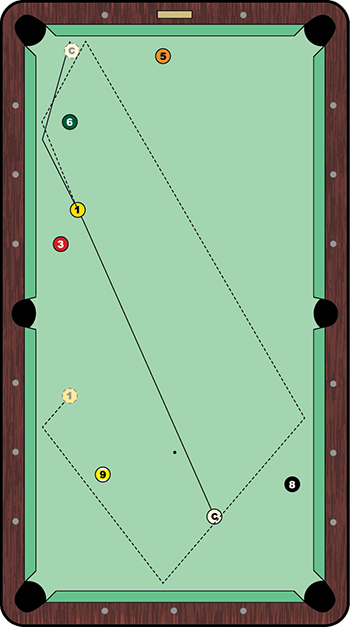 Up 8-4 in the race-to-11, Chang obliterated the rack and sank three balls on the break. But left with the layout shown in the diagram to the right, the lanky world-beater didn't have much to play with. The 1 ball was blocked from the top left corner by the 6. A push-out didn't seem likely, with the 1 ball sitting fairly open along the long rail.