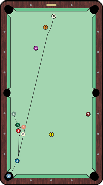 While the announcers questioned the prudence of such an aggressive shot, the Austrian jacked up his cue and aimed low on the cue ball. Popping the cue ball just an inch or two off the table, Ouschan cleared the 5 ball, with the cue ball drilling the 2 with a nearly full hit. The blue ball dropped in the bottom left pocket, while the cue ball spun back toward the headrail. It clipped the rail before nudging the 3 ball off the 6 and into the open.