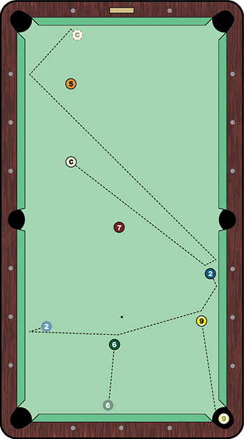 He had an open look on the 2 ball along the right long rail. But the 9 ball, blocking a straight path to the bottom right corner, complicated matters. The distances between the balls and to the pocket made a combination tricky. But safety options weren’t plentiful with only five object balls on the table.
