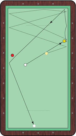 On his way to blistering the event's host, 60-26, in just 18 innings (then a U.S. record), Sayginer unleashed this tricky force-follow shot that left Lee laughing in disbelief. With the yellow just a ball's width off the rail, Sayginer loaded up on follow with a touch of left English. He drilled the cue ball with a short, rather punchy stroke, sending the yellow rattling around the top of the table. The cue ball obeyed the Turkish Prince's command, doubling the long rail before spinning off the short rail on its way toward the red near mid-table. Just missing the yellow on its way across the table for the fourth time, the cue ball just barely glanced off the left side of the red before coming to a stop on the short rail on the other side of the table. Unfortunately for Lee, Sayginer turned in another brilliant performance in the next round, as he won a 50-32 match that finished in just 14 innings - as the two paired for an eye-popping combined average of 5.857. (Video clip provided by Accu-Stats Video Productions.)