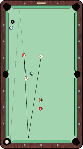 But in the final, a race to 5, Daulton had his work cut out for him after dropping the first three games. He battled back to within a rack at 3-2, when he approached the table shown in the diagram. Trailing in the game, five balls to four, Daulton, who was shooting at the bottom left pocket, had plenty of options.