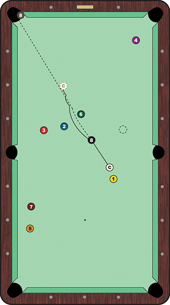 With both players on the hill in the race-to-10, Filler began working his way through the stripes. The table wasn't overly challenging, but position from the penultimate ball to the 8 was a bit tricky. Filler had planned to sink the match-winning 8 in the left side pocket, with the cue ball stopping near the outline shown in the diagram.