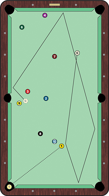 Shaw had no problems adjusting to the extra real estate, running out to a 5-0 lead in the race-to-11. He sank the 5 ball on the break, only to find himself in the tough spot shown in the diagram.