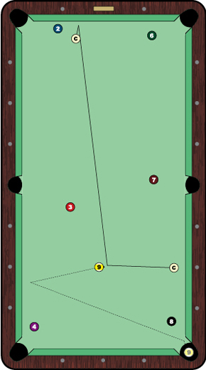 Just days before his 56th birthday, the bank-pool specialist pulled off an amazing run in the Derby’s old Executive West. Dropping the first game in the race to 3, Hogue ran five-and-out in the second to get even with Daulton. He then made the first two banks in the third game and found himself in the position shown in the diagram. Up against the rail, Hogue passed up the possibility of banking the 4 ball cross corner, opting instead for this shot on the 9 ball.