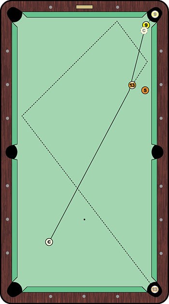 Jones opted for a defensive shot — one that required an immense amount of skill and speed control. As you could guess, if you are playing safe in one-pocket, you are not in a great spot when you have to go rail first. But Jones played a kick perfectly, rolling the cue ball off the long rail and into the 13. With a bit less than a half-ball hit, he placed the cue ball up against the 15 near the jaws of Woodward's pocket. The 13 bounced off the foot rail, ending up a ball length to the left of its original position.