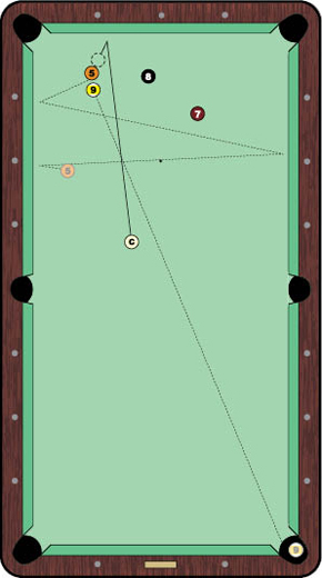 Take the 1992 Bicycle Club Invitation in Bell Gardens, Calif., as an example. In the hot-seat match, "Captain Hook" had the break in the case game of a 12-12 set against CJ Wiley. Making a ball on the break, Sigel ran into a bit of trouble getting position on the 5, which was partially hidden by the surround 8 and 9 balls. With the 3 ball deep in the lower right corner pocket, Sigel drew the cue ball off the left long rail in hopes of then sending the 5 into the top left corner. But he fell a bit short, ending up at the position shown in Diagram 1. He didn't have a clean look at the 5, so he was forced to improvise. Taking a minute to get a few good looks his predicament, Sigel loaded up on left English and spun the cue ball off the rail for a nearly full hit on the 5 ball. The 5, just a smidge to the left of the 9, then threw the match-winning ball toward the bottom right corner. As the 5 ricocheted between long rails, the 9 ball barely snuck inside the left side of the corner pocket. Wiley, the tough-luck loser in this 25th rack, then went on to lose to Kim Davenport in the third-place match. In the final, Sigel then trounced Davenport in the shortened championship set, 9-5, for the $12,000 payday. (Video clip provided by Accu-Stats Video Productions.)